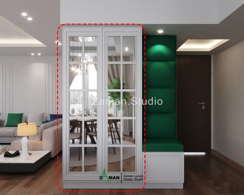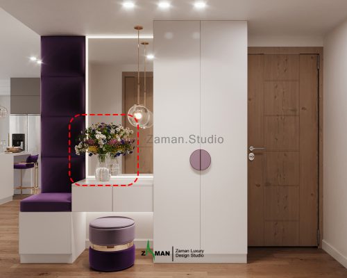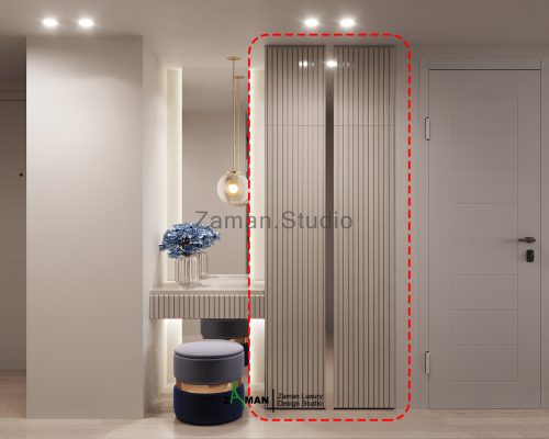 به تصویر بالا به خوبی توجه کنید، اگر فضای زیادی برای ورودی ندارید میتوانید نیاز آینه در این قسمت را به این زیبایی در ترکیب با فریم درب های کمد تامین کنید. این تصویر مربوط به پروژه 95 متری مرزداران ما هست که در بهار سال 1401 تحویل دادیم.